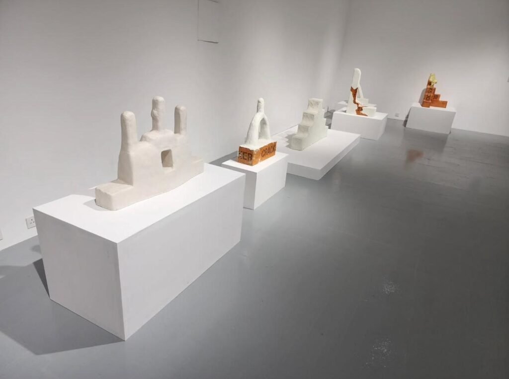 In this exhibition, the artist presents architectural dissections of a specific unit known as the "Sawm’ah"—a small clay structure placed on rooftops. It is believed that this feature served as a signature of the builder, signifying his craftsmanship and skill in construction. Positioned prominently on rooftops, the Sawm’ah reflected the builder’s artistry and mastery. However, the function of the Sawm’ah remains a topic of debate. Some sources suggest that it symbolized wealth and social status, while others link it to offering altars that were common in neighboring regions and held religious or spiritual significance in pre-Islamic Arabian traditions.