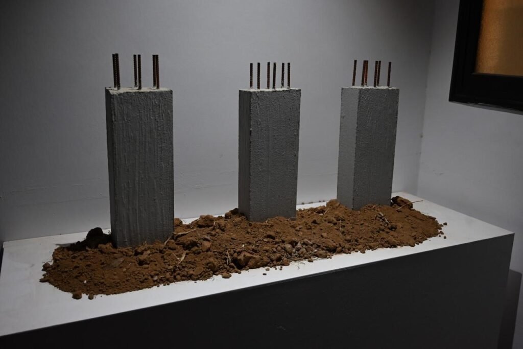 In a related visual statement, Hussain Muhay presents miniature cement columns shaped like agricultural seedlings, ready to be planted in the soil. This concept serves as a stark metaphor for the rapid spread of concrete structures, where cement has become so widespread that it is treated as a tradable commodity—ready to be transported, sold, and used anywhere. The irony lies in how these cement "seedlings" replace the once-thriving fruit tree saplings that farmers traditionally planted in the past. In a related visual statement, Hussain Muhay presents miniature cement columns shaped like agricultural seedlings, ready to be planted in the soil. This concept serves as a stark metaphor for the rapid spread of concrete structures, where cement has become so widespread that it is treated as a tradable commodity—ready to be transported, sold, and used anywhere. The irony lies in how these cement "seedlings" replace the once-thriving fruit tree saplings that farmers traditionally planted in the past.